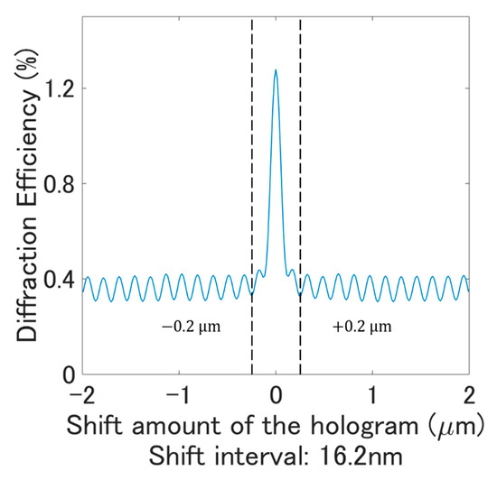 The relationship between the one-dimensional shift amount on the hologram plane and the diffraction efficiency in a hologram from which unnecessary interference fringes were removed is shown in Figure 5. Here, the diffraction efficiency was represented by the ratio of the sum of the intensities of the entire signal area to that of the whole reconstructed image plane. The horizontal axis represents the one-dimensional shift amount on the hologram plane, and the vertical axis represents the diffraction efficiency. From Figure 5, it is shown that the diffraction efficiency was maximized when the shift amount was zero, and it decreased significantly by a hologram shift of . However, the diffraction efficiency did not decrease to a value close to zero, resulting in a bias of about . A main reason of this is the high reconstruction tolerance of the surface hologram. Namely, random diffracted lights without information appeared though the image with information disappeared due to the shift selectivity.
