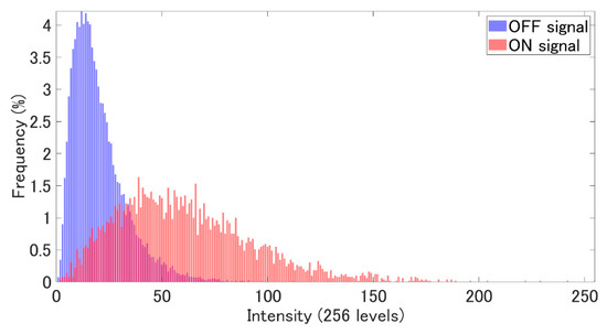 First, the example of the signal area of the reproduced image in the surface holographic memory is shown in Figure 3. Here, Figure 3a shows the assumed original signal area pattern, and Figure 3b shows the signal area of the reconstructed image in the case that the unnecessary interference fringes were not included. These reconstructed images were assumed to be acquired by an image sensor, and the intensity level was corrected to 256 levels. As shown in Figure 3, we saw that the signal pattern in the collinear system was properly reconstructed even in a surface hologram whose thickness was substantially zero. Then, the effect of removing unnecessary interference fringes was evaluated. Histograms with and without the unnecessary interference fringes are shown in Figure 4a,b. The horizontal axis represents the intensity level, and the red and blue histograms respectively indicate the intensity distribution for the area within the reconstructed image that was ON pixel or OFF pixel respectively in the original signal pattern, and the vertical axis represents the percentage of the frequency. It can be seen from Figure 4 that the reconstructed image, when the unnecessary interference fringes were removed, was clear enough to reconstruct the original signal (error free can be expected by using error correction methods).