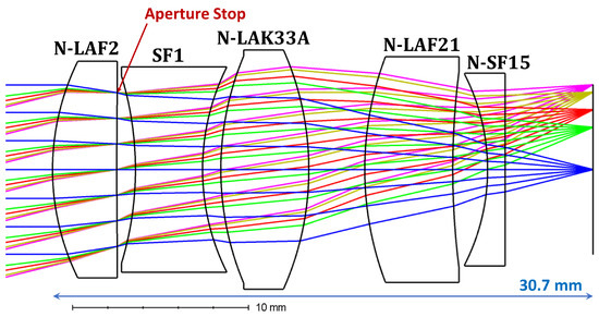 f/2, and all surfaces are spherical. The aperture stop is placed on the back surface of the first lens. The distance from the first surface vertex to the image plane (i.e., total track length, TTL, in Zemax) is 30.7 mm, and the lens has less than 1% optical distortion.