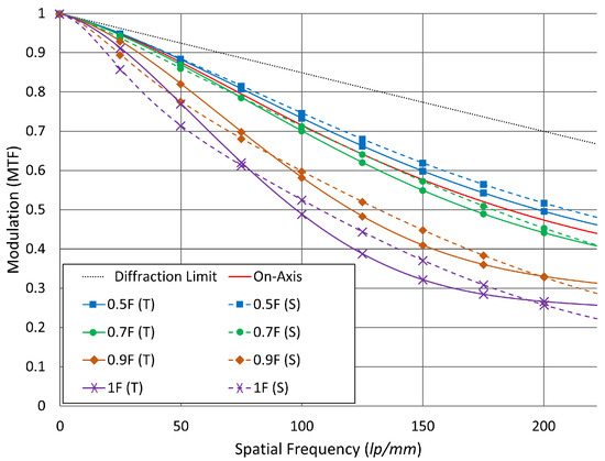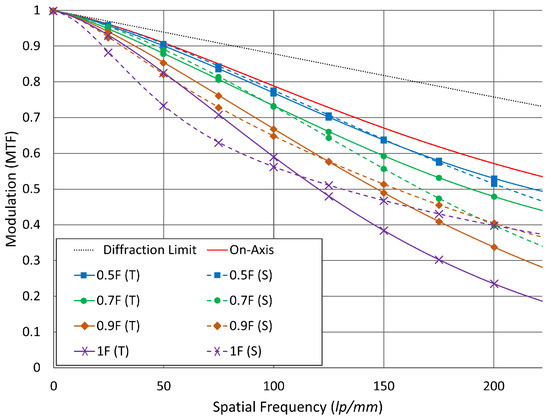 The optical performance is evaluated on-axis, and at 0.5, 0.7, 0.9 field locations at the image plane. Modulation transfer function (MTF) plot for the lens at the nominal temperature (20 °C) is shown in