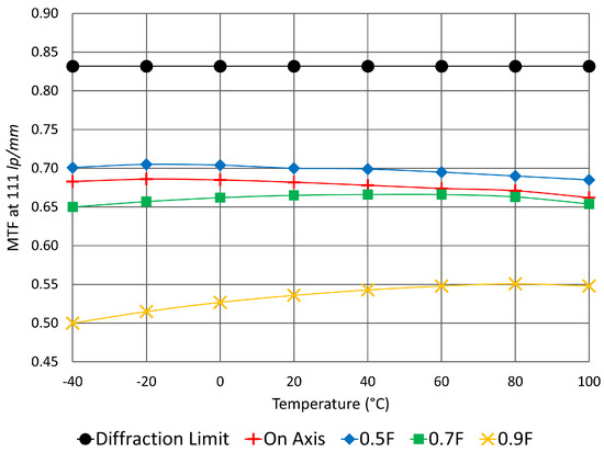 To demonstrate athermal performance, minimum MTF at 111 lp/mm is plotted at different field locations for the temperature range of