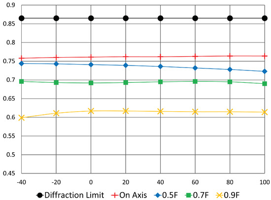 Figure 8. Temperature variation is very small for all field angles up to 0.9-field. MTF is greater than 0.6 over the entire temperature range up to the 0.9-field. Introducing the two aspherical surfaces allowed for achieving better MTF at the mid frequencies and also better athermalization together with increased light throughput.