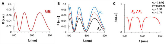 The calculated reflectance curves from a thin film with a thickness d = 800 nm and an effective refractive index n1 = 1.38 (using SF10 substrate with n2 = 1.7, in air, ε0 = 35°): (A) The conventional reflectance (RIfS) curve with the interference pattern, calculated by Equation (7); (B) The s- and p-polarized components of (A) and their average, calculated by Equations (12) and (13); (C) The polarized reflectance curve, which can be measured as the ratio of s- and p-polarized components, calculated by Equation (14).