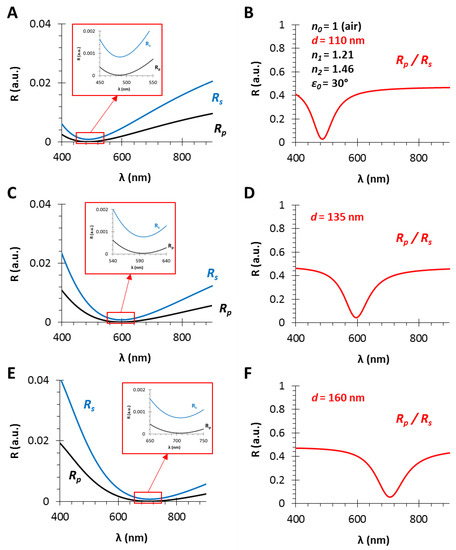 The angle of incidence is ε0 = 30°, the RI of the medium is n0 = 1 (gas phase) and the model substrate is fused silica glass (n2 = 1.46), since these are typical gas phase VOC sensor conditions [6], except the low layer thickness which is much lower than the suitable value in RIfS technique. It can be observed in Figure 3A,C,E that the interference pattern barely appears because of the low sensing layer thickness, compared to Figure 2B (d = 800 nm). In contrast, when the ratio of the s- and p-polarized components is measured, the obtained reflectance curve has a definite extreme value (edge). These curves (corresponding to different layer thicknesses) have the similar shape, contrast and FWHM (full width at half maximum) with the increase in layer thickness d, while only the edge shifts toward the higher values (red shift) (see Figure 3B,D,F). The wavelength shift, and thereby the wavelength of the edge can be precisely tuned: the scaling factor is λ/d = 4.5 nm/nm.