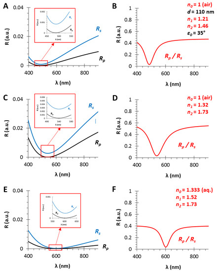 The calculated polarized reflectance curves from thin films with a film thickness of d = 110 nm and different effective refractive indices (using fused silica substrate with n2 = 1.46, in air, ε0 = 35°): (A,C,E) The s- and p-polarized components of the conventional RIfS curves (from Equations (12) and (13)); and (B,D,F) The ratio of the s- and p-polarized components (from Equation (14)) in the case of n1 = 1.21, 1.32 and 1.52 thin film refractive indices, respectively; n1 values are optimized and calculated as the geometric mean of n0 and n2.