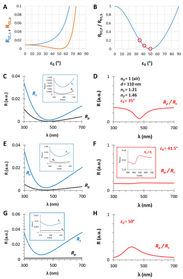 (A) The calculated (s- and p-polarized) reflectance curves and (B) their ratio as the function of the incident angle (ε0) for a gas/thin film interface with n0 = 1 and n1 = 1.21; (C,E,G): The calculated (s- and p-polarized) reflectometric interference curves and (D,F,H) their ratios in the case of an n1 = 1.21 and d = 110 nm thin film on fused silica substrate (n2 = 1.46), in air, with different incident angles, ε0 = 35, 41.5 and 50°, respectively.