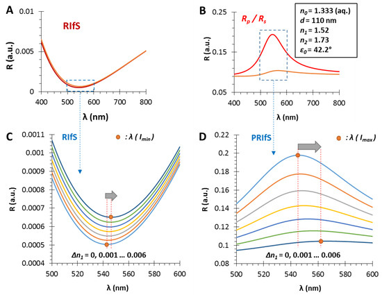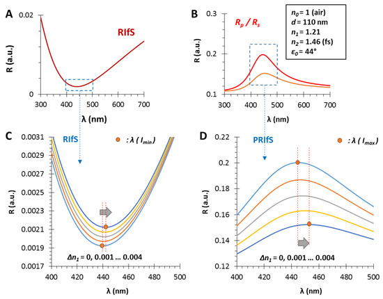 The calculated reflectometric interference curves for (A) the conventional and (B) the polarization method, in the case of an n1 = 1.21 and d = 110 nm thin film on fused silica substrate (n2 = 1.46), in air, by applying an incident angle of ε0 = 44°; during the measurement, ΔR and Δλ values are monitored as a function of Δn1; (C,D) The region of interest zooms to the red shift of the RIfS and PRIfS curves, while n1 increases from 1.21 to 1.214.