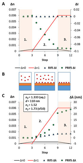 The results of the simulated model experiment: (A) The ΔI curves for the conventional (RIfS ΔI) and the polarized (PRIfS ΔI) cases due to Δn0 = ± 0.0003 (steps 1. and 3.) or Δn1 = 0.006 (adsorption, step 2.); (B) Schematic drawings of the steps: 1. the dilute solution of the analyte reaches the measurement cell, 2. the immobilization process, 3. rinsing of the measurement cell; (C) The Δλ curves for the conventional (RIfS Δλ) and the polarized (PRIfS Δλ) cases due to Δn0 = ± 0.0003 (ranges 1. and 3.) or Δn1 = 0.006 (adsorption, range 2.).