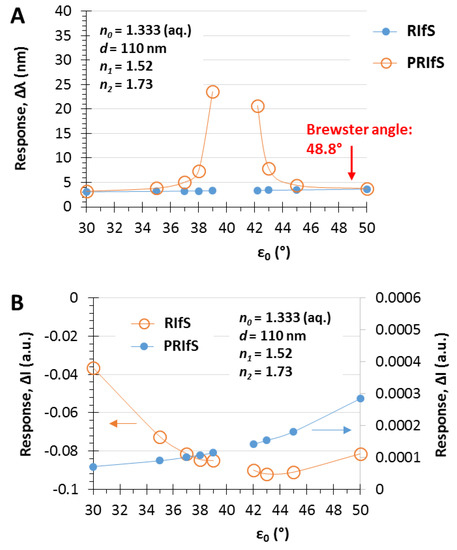 The simulated experiment presented in Figure 7 was carried out by applying an incident angle of ε0 = 42.2°. Figure 8 shows the ΔI and the Δλ values as the function of ε0 corresponding to step#9 when Δn1 = 0.006 and Δn0 = 0.0003. The similar efficiency of the two methods can be observed at low angle of incidence values and near the Brewster angle (Figure 8A), as well as, the significant improvement of the PRIfS technique near the transition region (see Figure 5F) and the two orders of magnitude difference in ΔI values (Figure 8B). Δλ values in the transition domain are unrealistically high (~100 nm); thus, the simulations cannot be carried out. However, it should be noted that the model experiments are running by assuming ideal attributes, but the real laboratory conditions and the quality of the prepared thin films (such as surface roughness, layer thickness and refractive index inhomogeneity, spot size of the light, etc.) may reduce the ideal nature of the curves. The simulated Δλ sensorgrams corresponding to ε0 = 42.2, 43 and 45° incident angles (near the transition region) are presented in Figure 9A,B (RIfS and PRIfS, respectively).