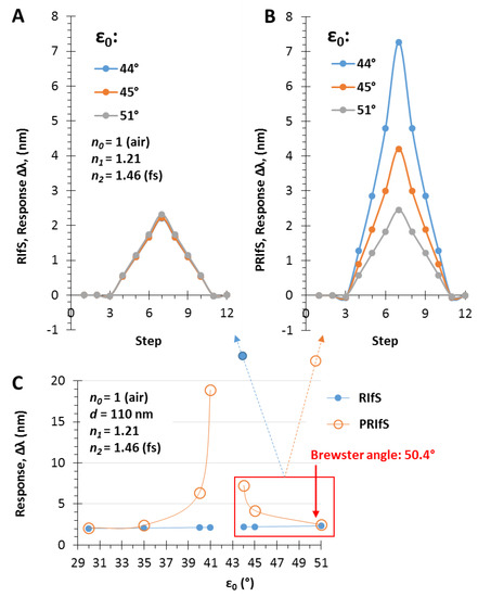 Δλ sensorgrams of (A) RIfS and (B) PRIfS techniques at different incident angles (ε0 = 44, 45 and 51°), due to Δn1 = ±0.004 refractive index changes (steps #4–9), in the case of a thin film with d = 110 nm and n1 = 1.21 on fused silica substrate, in air; (C) Maximal Δλ responses of RIfS (yellow) and PRIfS (blue) techniques due to Δn0 = 0.0002 and Δn1 = 0.004 refractive index changes as the function of the incident angle ε0.