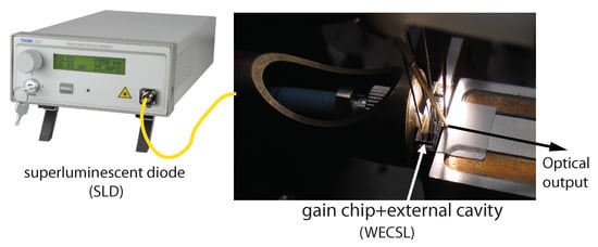 The detailed characterization of the WECSL used in our scheme was presented by R. M. Oldenbeuving et al. [13]. In a WECSL, an optical “gain chip”, developed in Fraunhofer Heinrich-Hertz-Institut [13], is integrated to an outer mirror coordinated into a waveguide chip, as shown in Figure 1.