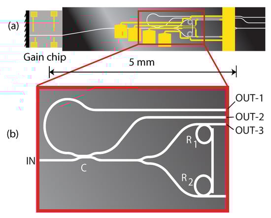 The schematic outline of the entire waveguide chip is shown in Figure 2. The waveguide chip accommodates a dual micro-ring resonator (MRR) structure [17], termed as an MRR mirror, which can be combined with a directional couplers. This magnificent combination acts as a frequency selective mirror. Moreover, a bi-directional coupler launches light from a straight waveguide into a “measurement channel” in order to monitor the performance of the laser and mirror.