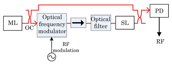 Different strategies proposed to date depending on optical injection locking techniques and side frequency injection locking can produce unadulterated microwave carriers. Moreover, the framework dependent on it has shown high stability and tunability for the carriers [18]. The mechanisms of the side frequency injection locking technique are discussed in this section. The master laser light is divided into two parts. One part of the light is frequency modulated to form optical side frequencies and one of the side frequencies is chosen by a filter and infused into the slave laser. The slave laser is injection-locked onto the side frequency of the master laser. The other part of the light from the master laser is heterodyned with the light from the injection-locked slave laser to produce the microwave carrier. The schematic of this lockup mechanism is shown in Figure 3.