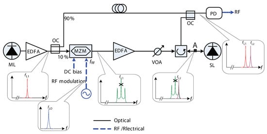 The waveguide chips of the master and slave lasers were butt-coupled to single mode fibers (SMFs). Two identical but separate WECSL lasers were used as a master laser and slave laser. The center frequencies of both lasers were around 194.05 THz. Four Erbium doped fiber amplifiers (EDFAs) were used from two different manufacturers, namely Alcatel (type 1686WM) and Firmstein Technologies Inc. (type PR25R). The fiber-coupled optical power of the master laser was measured to be 18.8 dBm. The amplified output power of the master laser was coupled out via 10% port of the 10:90 optical coupler (OC). Its output was modulated by a Mach–Zehnder modulator (MZM) (Avanex powerLog FA 20) biased at its half wave voltage , and modulated by a 20 dBm RF reference signal. The values of the bias voltage and the RF reference signal were chosen to suppress the optical carrier and to maximize the modulation side frequencies with first-order harmonic suppression of 8.2 dB. The output light from the modulator was passed through an isolator and again amplified using two EDFAs. Afterwards, the light passed through a variable optical attenuator (VOA) before it was split in a 3 dB coupler. The optical output from the 3 dB coupler was injected into the slave laser through an SMF. The fiber-coupled optical power of the free-running slave laser and the master laser before inserting to the slave laser (at Point A in Figure 4) were measured to be −16.8 dBm and 4.3 dBm, respectively. The total optical power at the positive first-order side frequency was 3.9 dBm. The remaining 90% optical power from the 10:90 coupler and the amplified output of the slave laser from the 3 dB coupler was combined in another 3 dB coupler, which finally went to a PD (Discovery Semiconductor DSC20S) and a microwave beat signal was observed using an RF spectrum analyzer (Agilent MXA N9020A). The optical signals were detected by an optical spectrum analyzer (Ando AQ6317) with a resolution of 0.01 nm. In this experiment, the wavelength and injection current of the optical carrier from the master laser were set to 1532.43 nm and 56 mA, respectively. The first-order modulation side frequency at the output of the MZM was tuned from 2 to 12 GHz using an RF reference. The natural wavelength of the slave laser was fine tuned so that it locked to the first-order side frequency. The slave laser can be tuned by either heating the MRR or injection current of the WECSL.