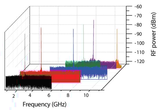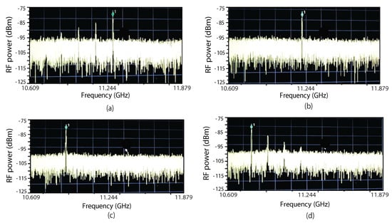 In the experiment, the injected power was attenuated with steps of 0.5 dB using a VOA. For each injected power, the locking range was measured by sweeping the side frequency of the master laser such that the sweeping range was higher than the full locking bandwidth, as shown in Figure 5. When the side frequency of the master laser is outside of the locking bandwidth, multiple beat signals would appear at the output of the PD, as shown in Figure 5a,d. As soon as the side frequency of the master laser comes within the locking bandwidth, injection lock occurs and unadulterated beat signal is generated. Moving the side frequency of the master laser within this locking range would not break this lock, as shown in Figure 5b,c.