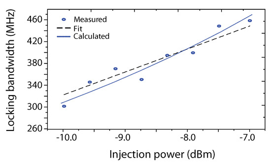 The locking bandwidth increases with an increase of injection power (or injection ratio, ), or decreasing the attenuation. No locking was observed below an injection ratio of −21.2 dB. The experimental measurements of locking bandwidths are compared with the theoretical calculation from Equation (1) and also plotted in Figure 6. The theoretical value of the Q factor for the WECSL was calculated as 1.6 × 104 [13]. The fit curve in Figure 6 is plotted for a Q value of 6.2 × 104. This leads to a calculated laser linewidth of 148 kHz, which is comparable to the measured laser linewidth of 25 kHz [13] and shows a good agreement with the Q factor determined by calculation.