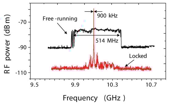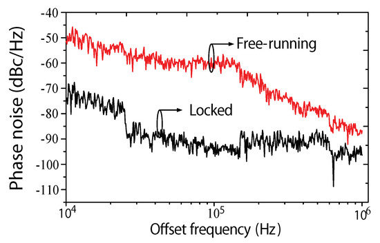 To investigate the improvement of the beat linewidth the phase noise measurements of the generated carriers were performed. The phase noise of the generated carrier was measured for both the free running (red line) and the injection-locked (black line) cases, and the results are shown in Figure 7.