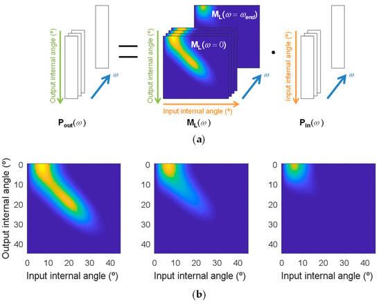 where pout(θ,ω) is the output intensity vector in the frequency domain, whose discretized version is Pout(ω) from Equation (27), that is shown here as a function of the propagation angle, as well as of the frequency. Therefore, the spatial aspects of the system can be modeled as an equivalent linear system whose frequency response is H(ω).