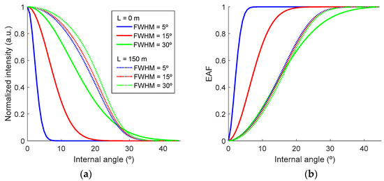 Normalized intensities (a) and encircled angular flux (EAFs) (b) as a function of the width of the Gaussian intensity profile as emitted by the source (L = 0 m) and at the output of a 150 m SI-POF.