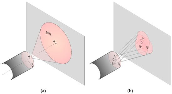 It is also possible to model lateral and longitudinal misalignments between fibers via analytical expressions [50,51]. This method is based on the hypothesis that each point in the fiber end surface acts as an independent uncorrelated source whose radiation pattern is given by g(θ), as shown in Figure 3a. We assume this function is related to the fiber Far Field Pattern (FFP). To obtain the total radiated intensity at any point in space in cylindrical coordinates R(r, φ, z), the scalar contributions are added from all radiating sources that reach that point (Figure 3b). As all functions involved have circular symmetry, the zero-order Hankel Transform can be used to speed up and simplify calculations. Thus, the light intensity radiated from the end surface of this fiber is given by: