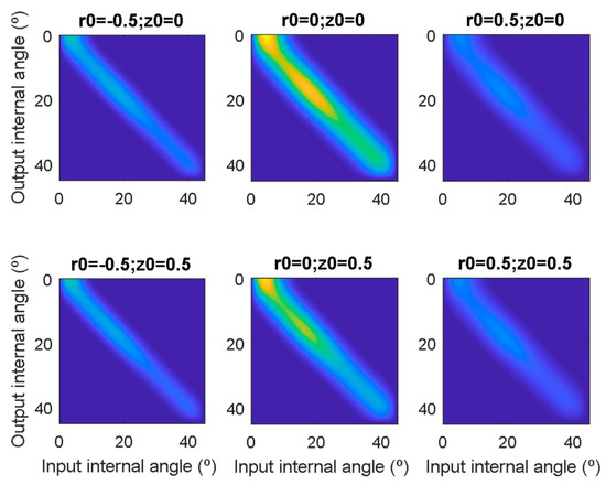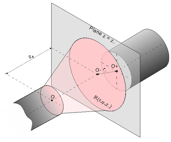 Once the radiated intensity has been obtained, misalignment loss is calculated assuming that the intensity captured by the receiving fiber is the fraction of intensity radiated from the first fiber that overlaps with the core surface of the second fiber, as shown in Figure 4. In this case, the model produces a scalar power-loss factor lp(r0, z0) for a given pair of misalignments [51]. A more flexible approach is to calculate the proportion of light that on exiting the radiating fiber at a given angle of interest in free-space (thus, an external angle) θi,ext, is able to reach the receiving fiber. This is equivalent to assuming that each point of the fiber radiates light in a very narrow angular range centered at that angle. Then, instead of a circular pattern, its projection onto a perpendicular plane will be a very narrow ring. The equations to calculate this angular loss function are: