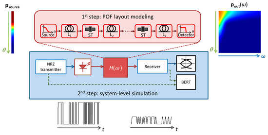 While this two-step approach can be quite efficient, especially when the time-domain signal includes a large number of bits (i.e., it provides for a reduced number of components to simulate in the second step), it does have a couple of notable drawbacks: (1) it can be tedious to work with two separate software packages, (2) it only allows access to the transmitted time/frequency domain signal at the input and output of the whole POF system, since the entire system is collapsed into a single black box. To overcome these issues, a one-step approach that integrates the temporal aspects of the signal transmitted through the POF system with the time-space characteristics of the system has been introduced [59,60]. This approach overcomes the first drawback since it fits naturally into a single simulation environment. It overcomes the second drawback since it allows monitoring of the optical intensity, time-domain transmitted signal, or any other desired measurement at inputs and outputs of all the components constituting the POF system. Figure 7 shows schematically the general idea of the one-step approach. The one-step example is shown in the frequency domain, although it will be equivalent to work in the temporal domain. Optical intensity vectors P(ω) at the output of the system components are represented in 2-D according to their dimensions: frequency ω and propagation angle θ.