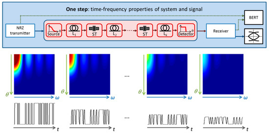 As can be observed from Figure 7, in the one-step simulation approach, the optical intensity vector at the output of the transmitter, which is propagated throughout the system components, contains not only the spatial but also the frequency properties of the transmitted signal. Therefore, time-domain signals can be easily extracted at any point of the link from the corresponding intensity vectors in order to obtain the desired system-level performance measurements such as BER or eye diagram [61,62]. The derivation from the two-step to the one-step methodology can be done very easily by adding the signal frequency properties as explained in the following. Considering that a data signal s(t) is to be transmitted through a POF link, the output data signal r(t) can be obtained using the inverse Fourier transform and according to the two-step approach as: