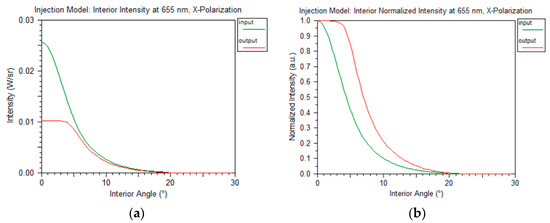Injection model intensity profile at input and output: not normalized (a) and normalized (b), showing the strong initial power diffusion from lower to higher angles.