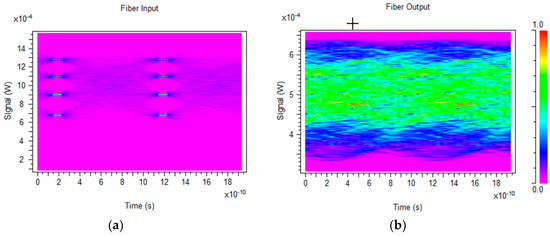 Simulated POF input (a) and output (b) eyes, showing the effects of intermodal dispersion and mode coupling.