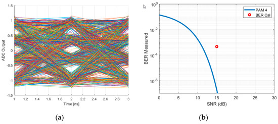 Particularly, the example demonstrates how PAM-4 modulation with DSP equalization at the receiver can help overcome the inherent bandwidth limitations of POF at Gb/s data rates for short-distance data interconnects [6,63]. Based partially on work presented in [63,64], Figure 8 illustrates a topology that implements end-to-end 1-Gb/s PAM-4 transmission over 1-mm diameter SI-POF. ModeSYS is used to simulate the fiber using the computationally efficient model based on the Gloge power-flow equation, while MATLAB co-simulation models the transmitter and receiver DSP using functions from the OptSim DSP Library for MATLAB. The transmitter generates an electrical PAM-4 signal with Nyquist pulse shaping and pre-emphasis filtering [65], and the receiver DSP uses a least mean square (LMS) equalization algorithm to recover the transmitted symbols and analytically estimate the BER. A Fiber Injection block is used to model the impact of the strong initial power diffusion at the fiber input [23,29]. The large-core SI-POF parameters used in the simulation are based on extracted model parameters for a 1 mm diameter ESKA-PREMIER GH4001 fiber from Mitsubishi [23]. The fiber injection uses parameters from [30] for the power diffusion, as well as the same angle-dependent loss as that used in the fiber. We would expect that the fiber injection, which tends to spread the power to higher angles, should result in a slower overall system response and reduced system bandwidth. Figure 9a shows the intensity in W/sr (not normalized) as a function of internal angle. Figure 9b shows the normalized version, illustrating the strong power diffusion. Figure 10 depicts the optical eyes at the POF system input and output, showing eye closure due to intermodal dispersion and mode coupling. Figure 11a illustrates the recovered eye diagram after the receiver’s analog-to-digital conversion (ADC) and equalization, which has compensated for the eye closure, while Figure 11b depicts the analytically estimated BER in comparison with an ideal PAM4 reference curve. The BER of 4.6 × 10−4 is below an FEC threshold of 3.7 × 10−3 [66,67]. As described in [63], the supported bit rate for this typical system can be much higher than the 1 Gb/s used in this example. Close to the absolute bandwidth limit, we can also employ a detector coupler to eliminate the higher angle modes at the receiver, thus increasing the bandwidth; however, the resulting power loss in combination with the receiver sensitivity may force other system adjustments to meet the BER specifications.