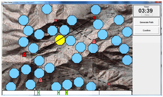 A domain that is particularly well suited to the inherent workload sensing abilities of fNIRS is in human–robot interaction. In context of this problem space, it has been demonstrated that as a user’s workload increases, an adaptive response from a semi-autonomous agent may increase the productivity, efficiency, and efficacy of the user in certain tasks [18]. This hypothesis is explored further in an experiment by Afergan et al. [17] wherein participants operated UAVs, or unmanned aerial vehicles, in a simulation. As the participant experienced higher levels of cognitive workload, the UAVs would assume a higher degree of autonomy, yielding optimized participant performance. The operator’s perspective of the UAV simulation is depicted Figure 1.
