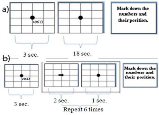 - Subjects were asked to view a screen displaying a five-digit number. The screen had a circular fixation point in the center, at which the subject was instructed to keep their focus. After 18 s, the subject was asked to recall the number and location of the cell that the number was located in (see Figure 2).