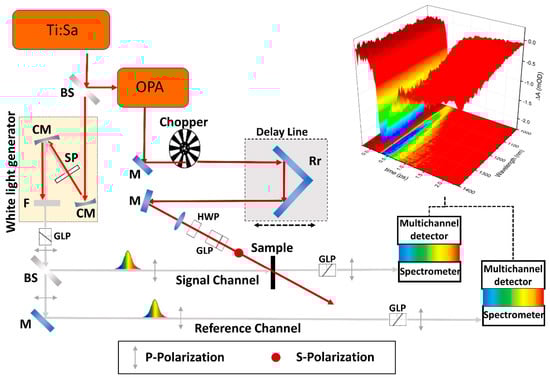 Combined with an optical parametric amplifier (OPA-TOPAS, Spectra-Physics, Santa Clara, CA, USA) this system generated sub-100 fs pulses in the ultraviolet, visible, and infrared spectral regions. This source was coupled to a setup for hyperspectral transient absorption spectroscopy [3]. The sketch of the setup is depicted in Figure 1. The samples were optically excited using the femtosecond tunable pulse delivered by the OPA. A mechanical chopper modulated the pump beam synchronously at f/2. The pump was sent though a mechanical delay line to control the optical path length and then focused on the samples.