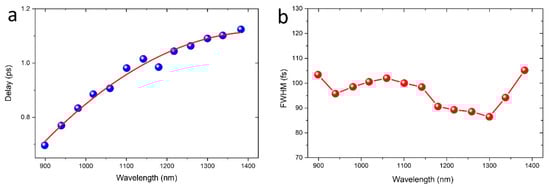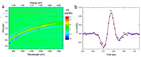 We extracted a significant number of kinetic traces (at least 10 traces for a robust sampling) and for each one we estimated (by the fitting procedure) the time zero at which pump and probe best overlap. The results of this fitting procedure are shown in Figure 3a for a number of probe wavelengths (blue circles). These data can be well modelled by a low-order polynomial function [16]. The solid red curve is a function (A = −1.8 ps, B = 4 × 10−3 ps/nm and C = −1.4 × 10−6 ps/nm2).