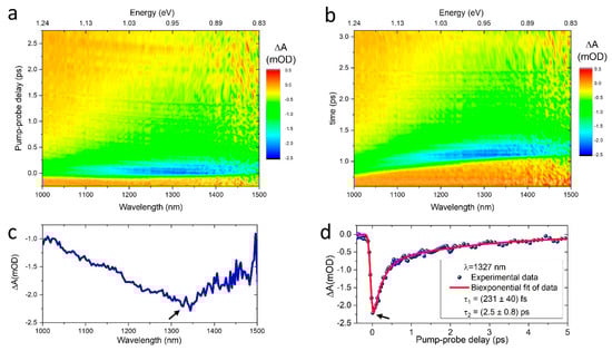 The differential spectra (ΔA) registered at a delay immediately after the pump-probe overlap, shows a maximum of the bleach at (1327−1345) nm (see panel c). The time-dependent behavior (Figure 4d) is fast with the overall bleach decaying in few a picoseconds. We report the time resolved ΔA, at a fixed probe wavelength of 1327 nm, for a pump fluence of 180 μJ/cm2. The data can be modeled with a biexponential fit which is in well agreement with the experimental data. The decay dynamic presents two characteristic lifetimes, τ1 = 231 ± 40 fs and τ2 = 2.5 ± 0.8 ps.