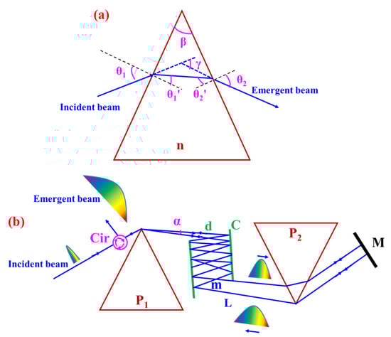Figure 1b exhibits the two-prism configuration for PTS using negative dispersion, mainly consisting of two prisms, a cavity, and a reflective mirror. The single prism is shaped as an isosceles triangle with high transmission efficiency. Note that the entrance face of prism is parallel to the exit face of prism , and the exit face of prism is parallel to the entrance of prism . Getting rid of the spatial dispersion requires propagation through an additional identical prism pair, which is realized by setting the pulse back to original prism pair to compensate for spatial dispersion and correct the pulse-front tilt. We place a collimator in front of prism P to reduce the divergence of the input beam and effectively eliminate the astigmatism. The mirror M used for reflecting back the beam light is coated with protected gold, which has 99.9% reflectivity in the band of 0.8–10 m. In addition, one free-space circulator is introduced into the two-prism configuration, to separate the incident and emergent beams in the same path [39].