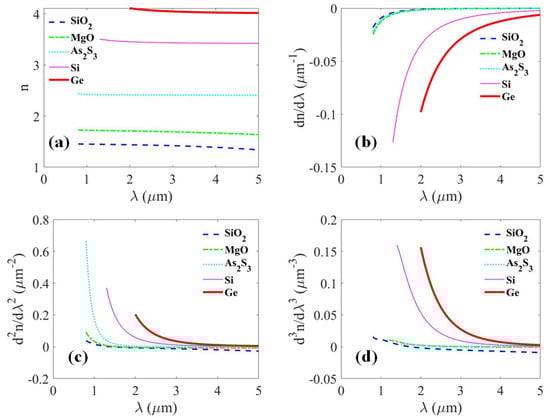 Refractive indices and dispersion properties of typical infrared materials: (a) Refractive index, (Herzberger equation) [40]; (b) first-order dispersion of material, ; (c) second-order dispersion of material. ; and (d) third-order dispersion of material, . The coefficients of A, B, C, D, and E are derived from [40]. The blue dashed line, green dash-dotted line, cyan dotted line, pink thin solid line, and red thick solid line represent the optical materials SiO, MgO, AsS, Si, and Ge, respectively.