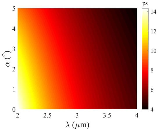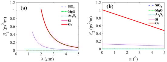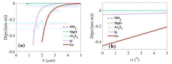 Taking a typical infrared material as an example, the dispersive properties of SiO, MgO, AsS, Si, and Ge are depicted in Figure 2. Material dispersion curves are obtained from dispersion formulas in the 0.8–5 m range [40]. Referring to Figure 3, the second-order dispersion coefficients are calculated and plotted with various infrared materials, as the light wavelength and propagation angle are varied. Figure 4 shows the simulated results of the dispersion constant in the infrared band, which indicate that the materials Si and Ge are capable of providing sufficient dispersion for PTS applications.