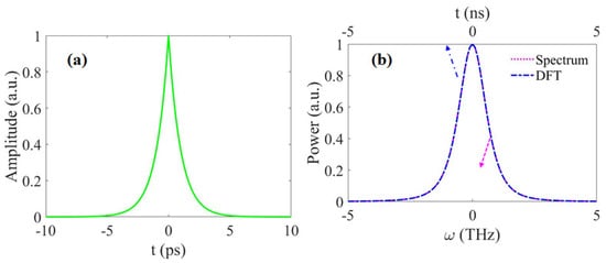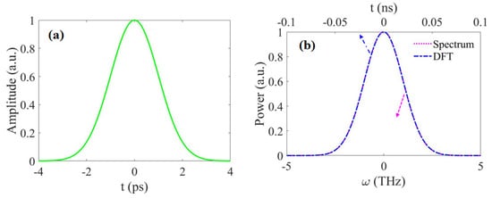where is the Fourier transform of the input optical pulse. According to Equation (27), it is clearly illustrated that the output temporal pulse envelope is proportional to the spectrum of the input pulse with a phase factor.