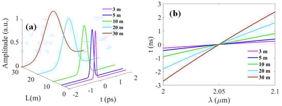 Conceptual description of the wavelength-to-time mapping procedure: (a) The optical pulse propagates along the prism pair in time and space domains, where the temporal profile of the optical pulse is described by ; and (b) time-to-wavelength mapping. The purple line, blue line, green line, cyan line, and red line represent a propagation distance L of 3 m, 5 m, 10 m, 20 m, and 30 m, respectively. The initial pulse width and spectrum bandwidth are 0.01 ps and 100 nm, respectively, and the propagation angle is 0.5.