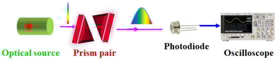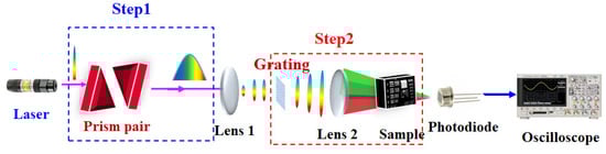 An ordinary STEI experimental configuration with a prism pair is schematically depicted in Figure 10. The system mainly consists of a mode-locked optical laser, a temporal disperser (the prism pair), a spatial disperser (a diffraction grating), a photodiode, and an oscilloscope for digitizing. The laser pulse first enters the prism pair, which time-stretches the spectrum of the pulse into a temporal data stream. The temporally stretched optical pulse is then spatially dispersed by the diffraction grating, into a spectrally rainbow beam which illuminates the specimen. The transmitted rainbow, which carries the transitivity profile of the specimen, is converged by the lens and recombined into a single spot in space. The temporal and spatial optical waveform is finally detected by the single-pixel photodiode and digitized by the oscilloscope.