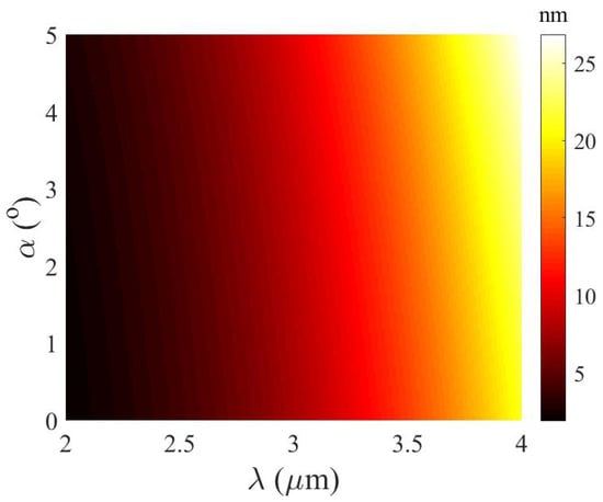 Spectral resolution of single-shot spectroscopy with varying light wavelength and propagation angle. The total propagation length is 15 m.