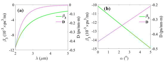 Third-order dispersion coefficient and dispersion constant D varying with the experimental parameters: (a) Varying with wavelength (); and (b) varying with propagation angle (m).