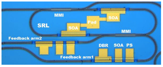 The layout of the device is illustrated by the picture shown in Figure 1. It has been fabricated using the standard building blocks from the Oclaro foundry, and a detailed description of the layout is given in [11]. As can be seen in Figure 1, the SRL has a racetrack-shaped geometry and optical gain is provided by two semiconductor optical amplifier (SOA) sections that are electrically interconnected. The laser cavity also contains two 2 × 2 multi-mode interference (MMI) couplers, which each couple 50% of the light out of the cavity. The outputs of the top MMI are coupled to the edges of the laser chip such that the CW and CCW modes can be measured. The bottom MMI in Figure 1 couples to two FOF branches. Each of these branches consists of a phase shifter (PS), an SOA and a distributed Bragg reflector (DBR). These components can be electrically tuned by adapting the current injected in the attached contact pad, such that we have control over the center wavelength (by changing the DBR current), the strength (by changing the SOA current) and the phase (by changing the PS current) of the FOF. Feedback arms 1 and 2 are used to control the FOF into the CW and CCW directions, respectively.