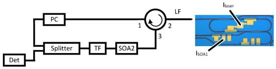 - Ermakov, I.V.; Beri, S.; Ashour, M.M.; Danckaert, J.; Docter, B.B.; Bolk, J.; Leijtens, X.J.; Verschaffelt, G. Semiconductor Ring Laser With On-Chip Filtered Optical Feedback for Discrete Wavelength Tuning. IEEE J. Quantum Electron. 2012, 48, 129–136. [Google Scholar] [CrossRef]