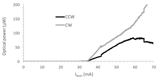 - Verschaffelt, G.; Khoder, M. Directional power distribution and mode selection in micro ring lasers by controlling the phase and strength of filtered optical feedback. Opt. Express 2018, 26, 14315–14328. [Google Scholar] [CrossRef] [PubMed]
