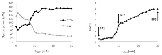 If we only applied FOF in one of the arms, the FOF had an additional effect that made the SRL somewhat unidirectional. This is illustrated by the measurement shown in Figure 4, where we plot the power in the two directional modes as a function of the current ISOA1 injected in the SOA of FOF arm 2 in Figure 1. The laser current Ilaser was kept constant, as shown in Figure 4, at a value of 60 mA. For low values of ISOA1, most power was emitted in the CW direction. But as ISOA1 was ramped up, the power in the CCW direction gradually increased at the expense of the power in the CW direction. This is to be expected from the feedback configuration used in this experiment as the FOF in feedback arm 2 coupled light from the CW direction into the CCW direction. The power distribution over the two directional modes is further detailed at the right-hand side of Figure 4, where we plot the ratio between the power in the CCW direction and the power in the CW direction. This so-called directional mode suppression ratio (DMSR) increased most strongly when ISOA1 increased from 0 to 11 mA, and then continued to increase at a slower pace for still higher values of ISOA1.