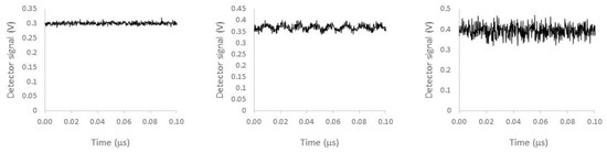 Time traces of the laser’s output as measured by the detector in the setup of Figure 2 at a laser injection current of 60 mA and an SOA current in the FOF path of 11 mA for different strengths of the COF by changing the current injected in SOA2 in the COF path: ISOA2 = 500 mA (left), ISOA2 = 600 mA (middle) and ISOA2 = 700 mA (right).