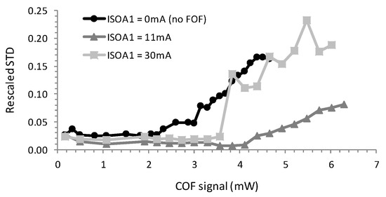 Rescaled STD from time traces of the laser’s output as a function of the COF signal strength as measured after the splitter in Figure 2 for different values of the ISOA1 (which controls the FOF strength).