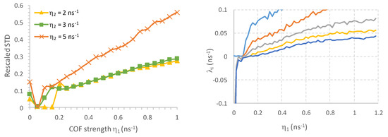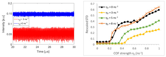 Simulated time traces in the CCW direction when the COF strength is η1 = 0.4 ns–1 without FOF in red and with FOF using η2 = 2 ns–1 in blue (left). Standard deviation of the simulated time traces of the laser’s output as a function of the COF strength η1 for different values of the FOF strength η2 (right).